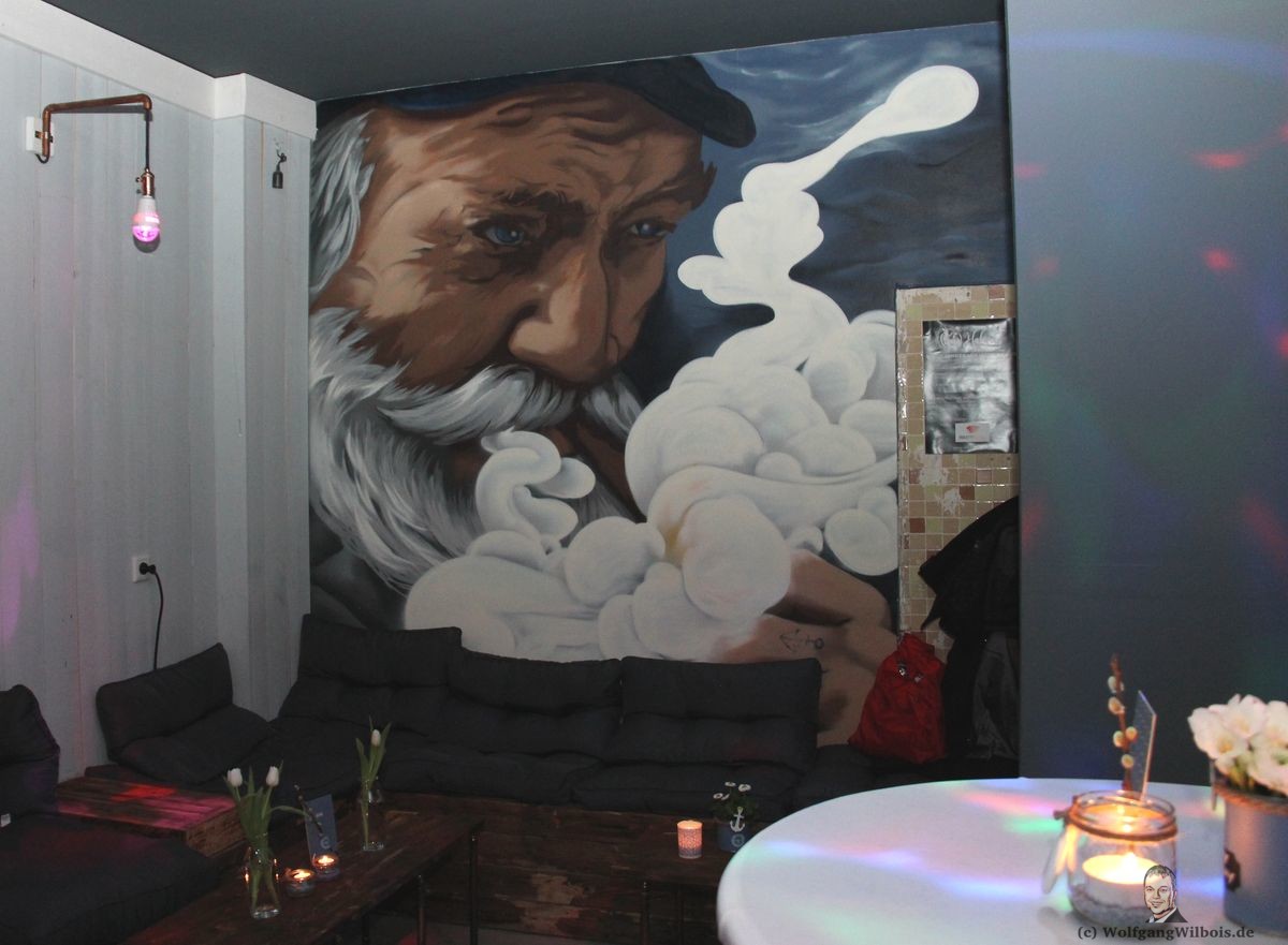 Als ‚Tischlein deck dich‘ wollte ich natürlich gerne etwas zur Dekoration beisteuern. Als erstes fällt im Hahni dieses wunderschöne große Gemälde vom Fischer auf, gleich rechts, wenn man zur Tür reinkommt. Darauf habe ich dann die Deko abgestimmt: Blau, maritim und rustikal.